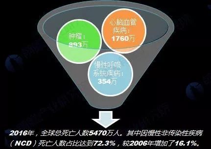 根據(jù)2016全球疾病負(fù)擔(dān)研究(Global Burdenof Disease Study 2016,GBD)公布的數(shù)據(jù)顯示,2016年全球總死亡人數(shù)為5470萬(wàn)人,其中死于慢性非傳染性疾病(NCD)人數(shù)占比達(dá)到72.3%,總?cè)藬?shù)為4004萬(wàn)人。2016年慢性非傳染性疾病(NCD)死亡人數(shù)較2006年增加了16.1%。    2016年,造成最多死亡人數(shù)的三類死因?yàn)椋盒哪X血管疾病-1760萬(wàn);腫瘤-893萬(wàn);慢性呼吸系統(tǒng)疾病-354萬(wàn)。