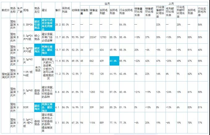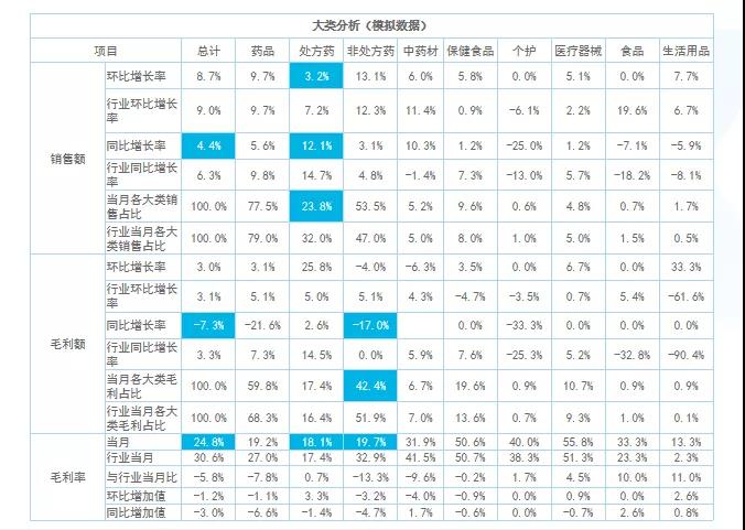 大類(lèi)分析主要看整體銷(xiāo)售結(jié)構(gòu),找出核心大類(lèi)的增長(zhǎng)機(jī)會(huì)點(diǎn)。例如,這組數(shù)據(jù)中不管是整體毛利率還是銷(xiāo)售額增長(zhǎng)率,都低于行業(yè)均值。細(xì)分處方藥、非處方藥及中藥等品類(lèi)的情況可以看出,處方藥的同環(huán)比銷(xiāo)售額以及銷(xiāo)售占比均低于行業(yè)值,而毛利率卻高于行業(yè)值?梢缘贸觯瓿踔贫ㄌ幏剿帪楹诵脑鲩L(zhǎng)大類(lèi)的策略沒(méi)有落地。所以,接下來(lái)做中類(lèi)、小類(lèi)跟單成分分析的時(shí)候需要進(jìn)行針對(duì)性監(jiān)控。