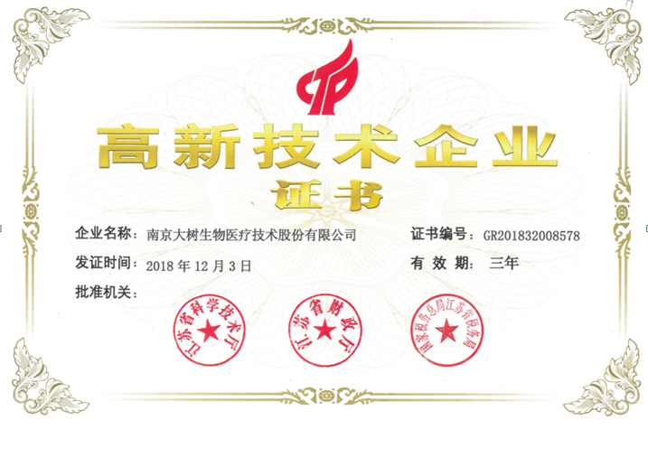 近日,我公司獲得由江蘇省科學(xué)技術(shù)廳、江蘇省財(cái)政廳、國(guó)家稅務(wù)總局江蘇省稅務(wù)局聯(lián)合頒發(fā)的“高新技術(shù)企業(yè)”證書(shū),由此正式邁入國(guó)家高新技術(shù)企業(yè)行列。南京大樹(shù)生物醫(yī)療技術(shù)股份有限公司是一家集研發(fā)、生產(chǎn)、銷售為一體的專業(yè)體外診斷試劑醫(yī)療器械公司,公司秉承“質(zhì)量為先、信譽(yù)為重、以人為本、精益求精”的質(zhì)量方針,通過(guò)我們的專業(yè)技能和不懈努力竭力為廣大客戶提供創(chuàng)新優(yōu)質(zhì)的產(chǎn)品及完善的售后服務(wù)!